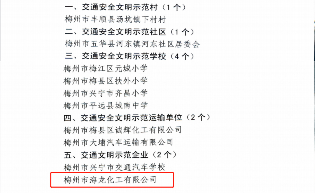 日前,梅州市公安局聯(lián)合市文明辦、市教育局等5個部門在全市開展交通安全文明單位創(chuàng)建活動,經(jīng)參評篩選,海龍化工被評定為“2021年度廣東省交通安全文明示范企業(yè)”,并榮獲“2021年度廣東省交通安全文明示范企業(yè)證書”,這是對我們海龍化工在交通安全文明領(lǐng)域的充分認可。
